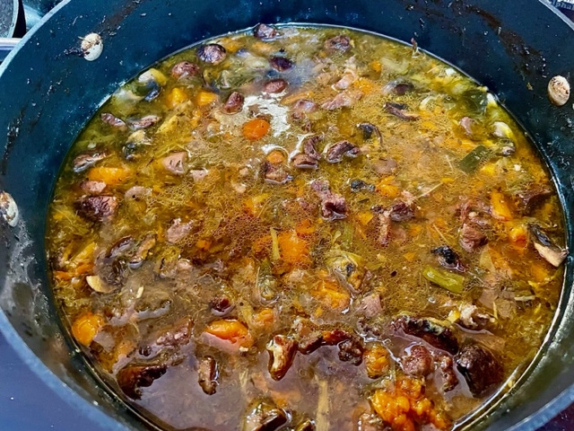 After 3 hours, uncover pot and lower the heat to medium. Add all mushrooms and leeks. Stir and cover. Cook for another hour.